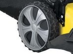 Мощность модели – 4,5 кВт. Для удобства пользователя агрегат оборудован мягкой рукояткой из вспененного каучука. Выброс травы выполняется в сторону, следом за газонокосилкой или в травосборник. Модель имеет 7 позиций для регулировки высоты скоса. Четыре пластиковых ударопрочных колеса на 2-х подшипниках на каждом (диаметр - передние 200 мм., задние 280 мм.) делают ход мягким и маневренным.