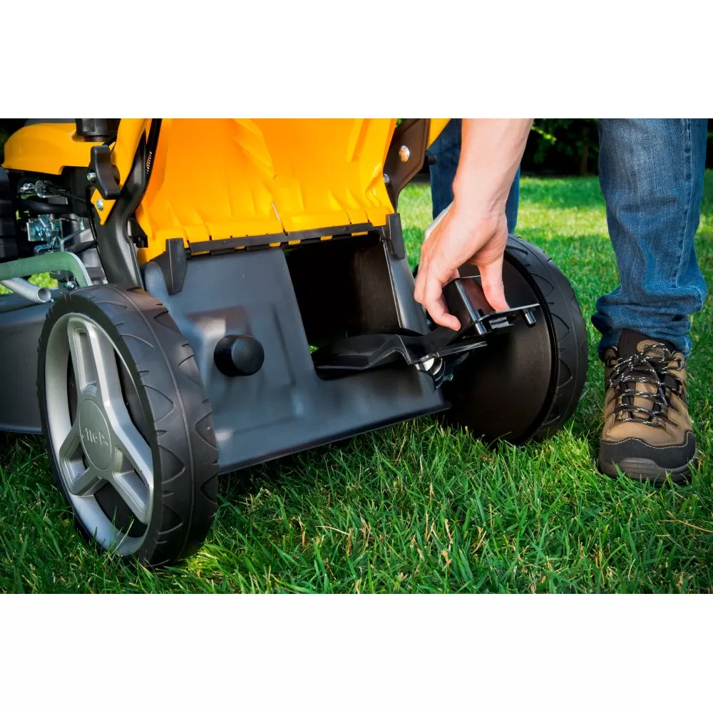 Газонокосилка Combi 53 S также включает в себя систему кошения 3-в-1: сбор травы, мульчирование, задний выброс, что делает её многофункциональным инструментом для ухода за газоном.