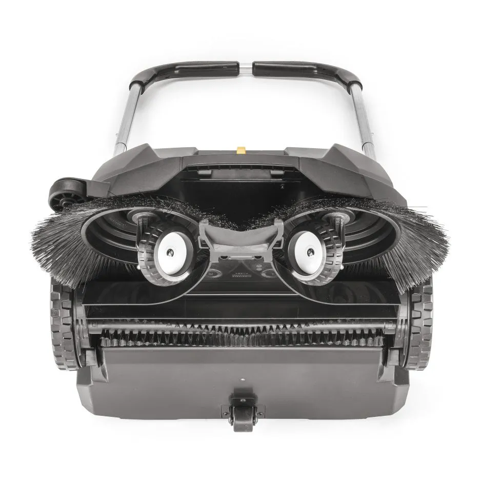 Машина подходит для твердых или бетонных поверхностей, включая подъездные пути, дорожки и парковочные площадки. Эта тихая и надежная подметательная машина оснащена двумя щетками диаметром 300 мм, которые вращаются в противоположных направлениях, с тремя фиксированными положениями высоты. На нижней части машины предусмотрена дополнительная щетка для сбора даже самого мелкого мусора.