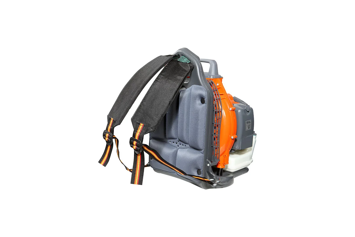 Виброизоляция воздуходувки состоит из 2 пружинных и 1 резинового амортизатора. Кроме того, у подвески имеется мягкая подушка под спину, которая обеспечивает дополнительный уровень защиты от вибраций. Все это значительно снижает уровень механических колебаний, передаваемых оператору.